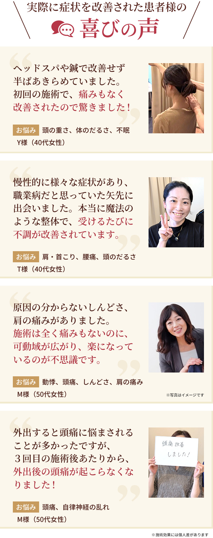 頭痛|片頭痛|緊張型頭痛|めまい|耳鳴り|メニエール病|眼精疲労|ドライアイ|花粉症|鼻づまり|突発性難聴|顎関節症|噛みしめ|歯ぎしり|顔面神経麻痺|三叉神経痛|